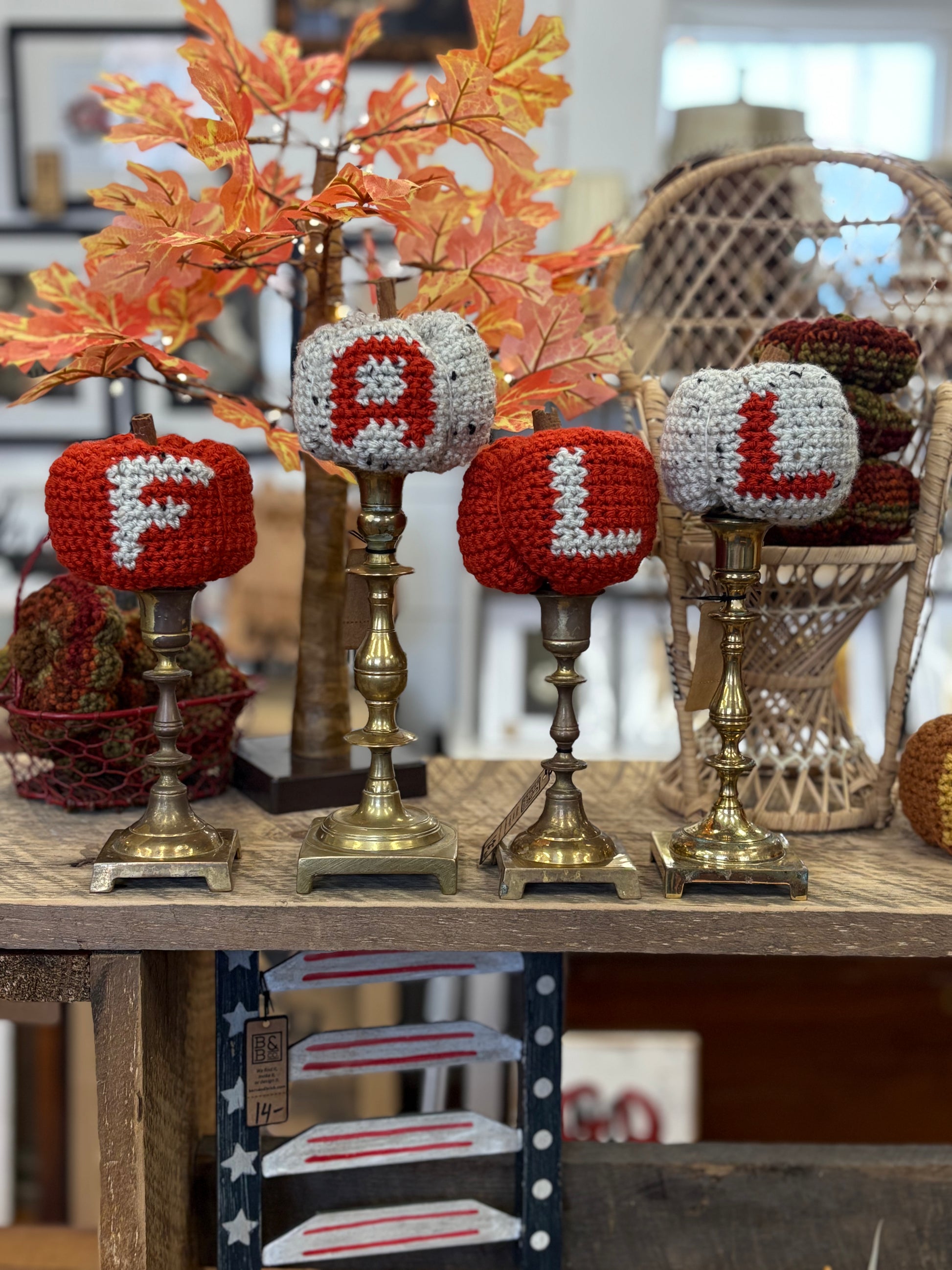 Crocheted pumpkins - Fall set. Comes with cinnamon sticks for stems. You can replace every year or replace with twigs or anything else you would like to use as a stem.