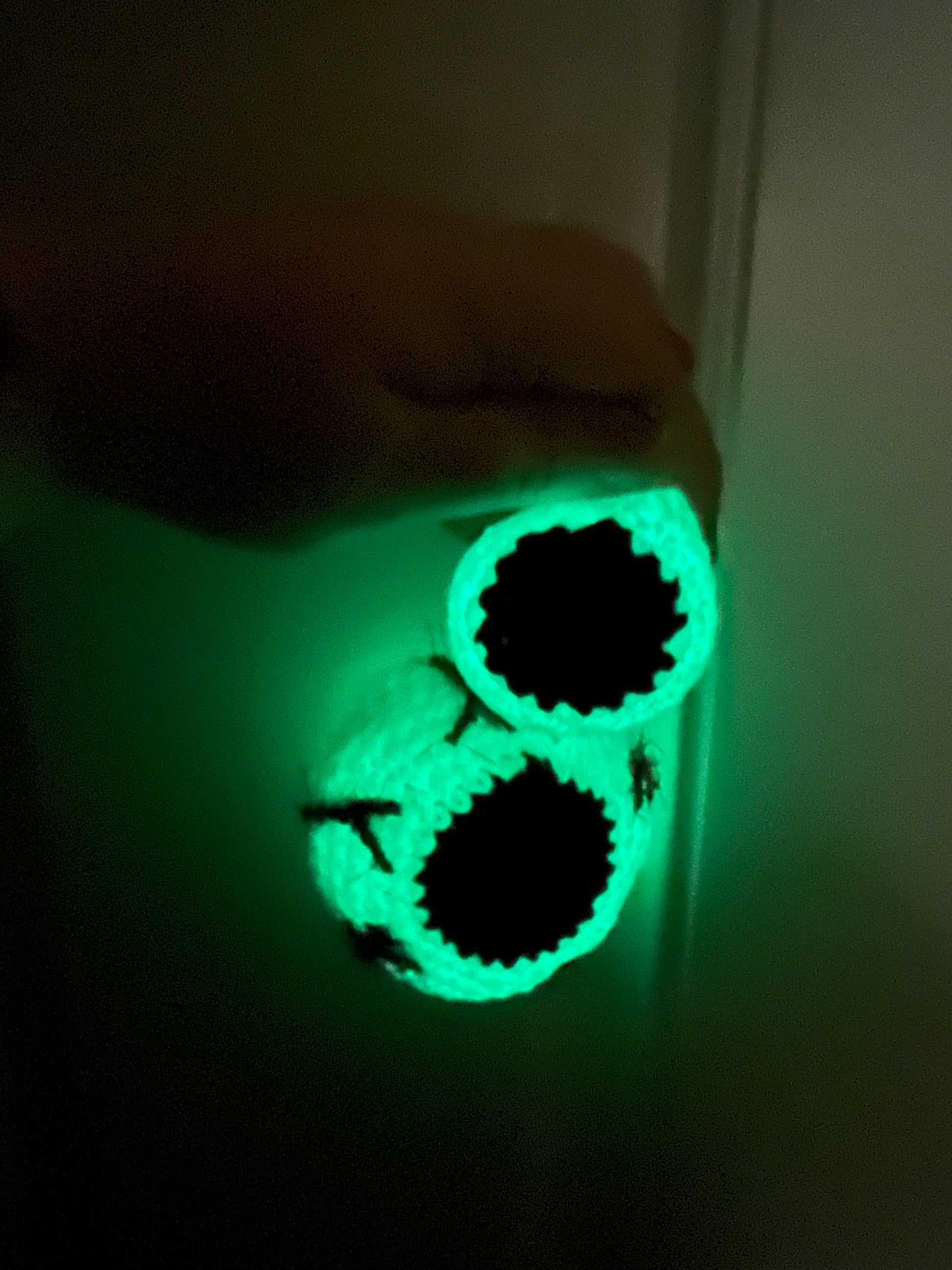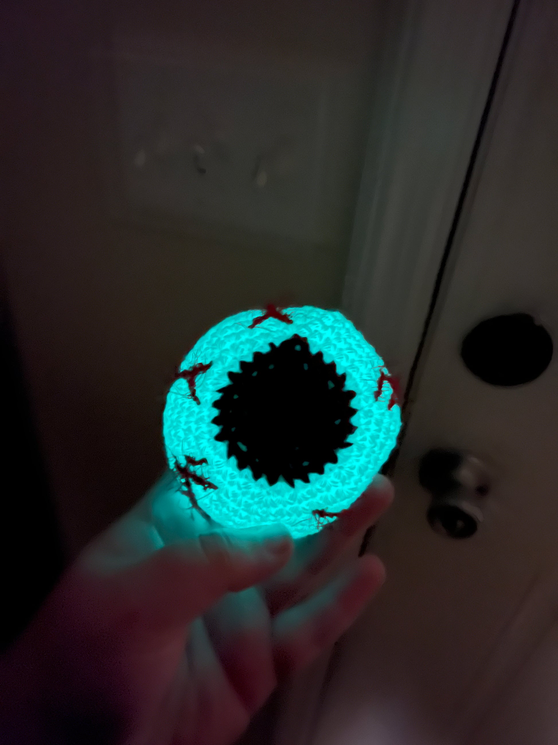 Crocheted large eyeball with choice of iris color. The white portion is made with glow in the dark yarn.