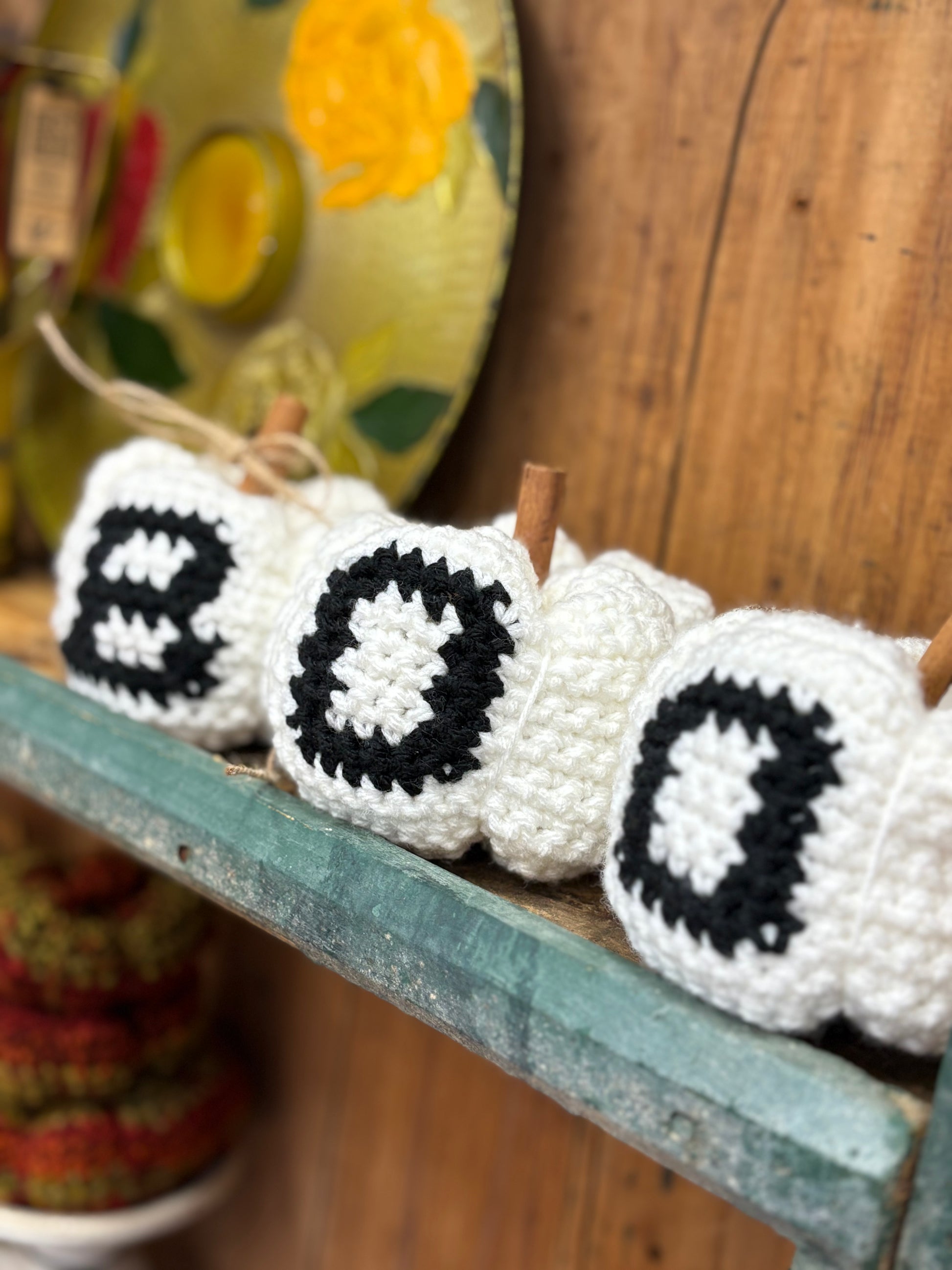 Crocheted pumpkins - BOO set. Comes with cinnamon sticks for stems. You can replace every year or replace with twigs or anything else you would like to use as a stem.